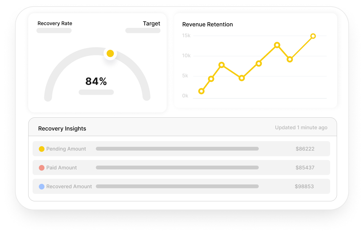Complete Transparency into Your Payment Health: You’ll face immediate and full insights into which accounts are at risk, which payment methods are most prone to failure, and precisely how much revenue you’re successfully recovering—all accessible from a single, intuitive dashboard.